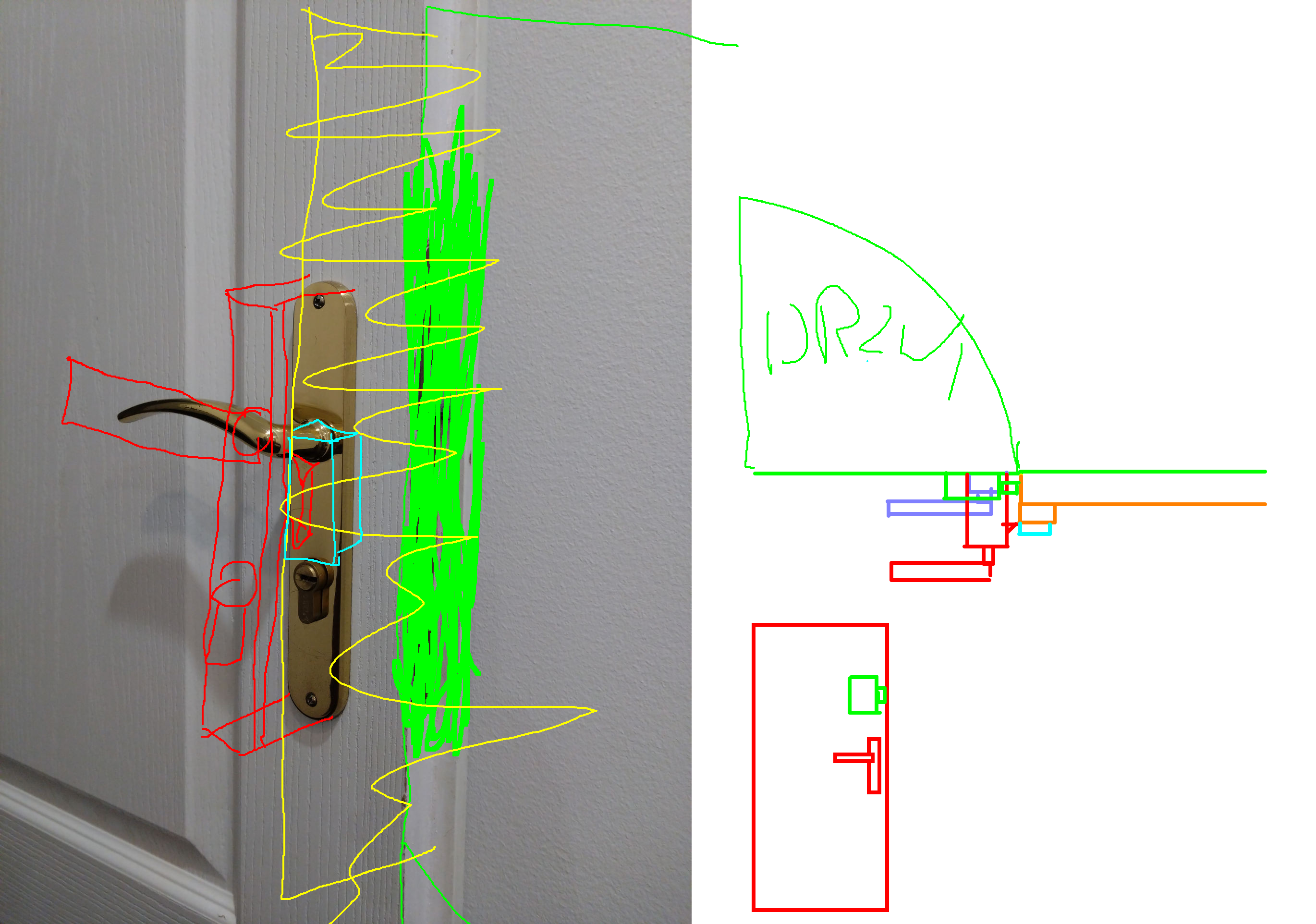Problemem jest zamontowanie elektrozaczepu do drzwi, ponieważ te otwierają się na zewnątrz. Wymaga to trochę porządniejszego planu i realizacji niż wersja pierwsza. Grafiki stworzone podczas sesji myślowej między qinn'em a Krakenem: